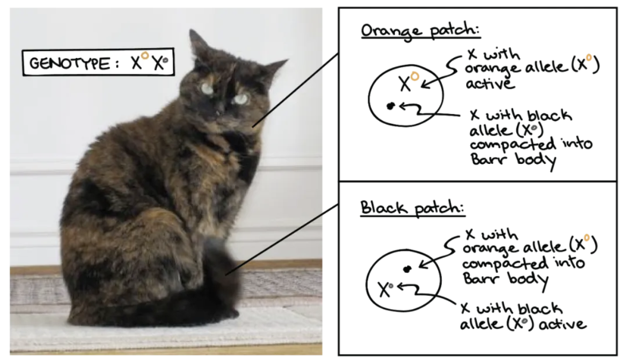 而在母猫身上会有一个特殊的现象:虽然一个细胞里的两条X染色体各自携带橘毛和黑毛相关的基因,它们的毛色并不会像用颜料把黑色和橘色混起来一样变成深棕色之类的颜色。那是因为雌性哺乳动物细胞内的染色体总有一条会随机失活,那么在X橘失活的区域,毛皮就呈出黑色,而X黑失活的区域,毛皮就是橘色的。