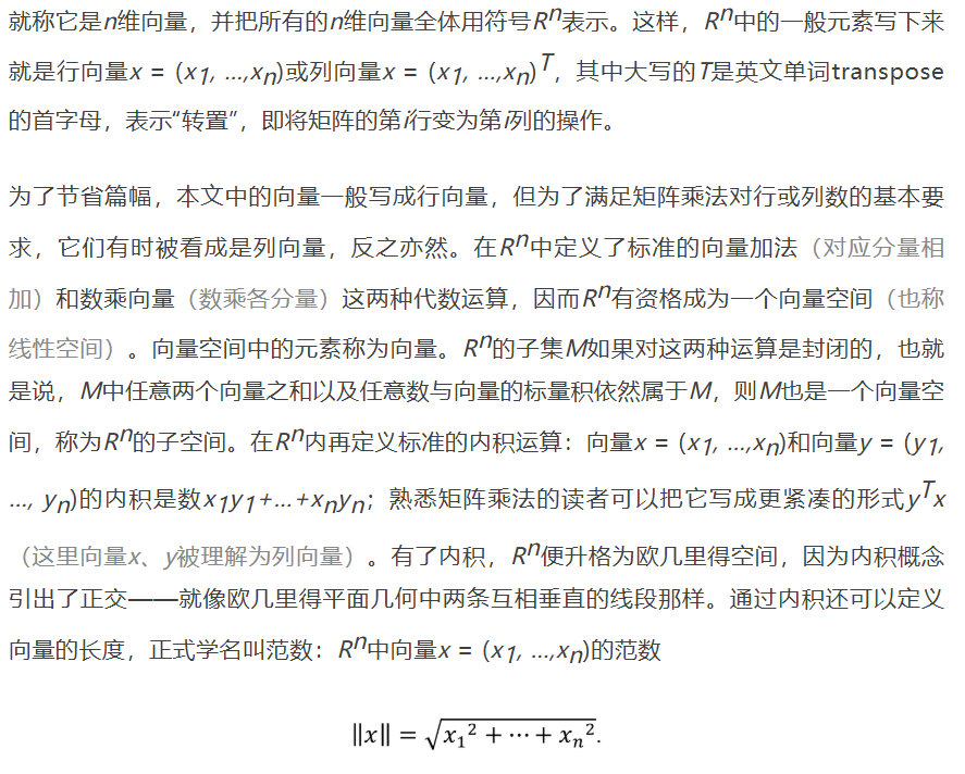 既然矩阵是上下左右排列整齐、有几行几列的一组数,它免不了要和只有一行的数组(称为行向量)和只有一列的数组(称为列向量)发生联系。某个向量中的分量个数如果是n,