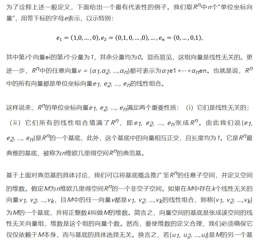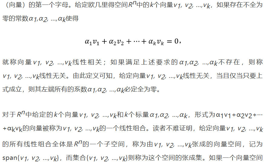 读懂了上面的例子,下面关于线性相关或线性无关的定义就不难理解了。由于涉及多个向量,我们不再使用x,y,z,而是改用带下标的字母v表示向量,这里的v是英文单词vector