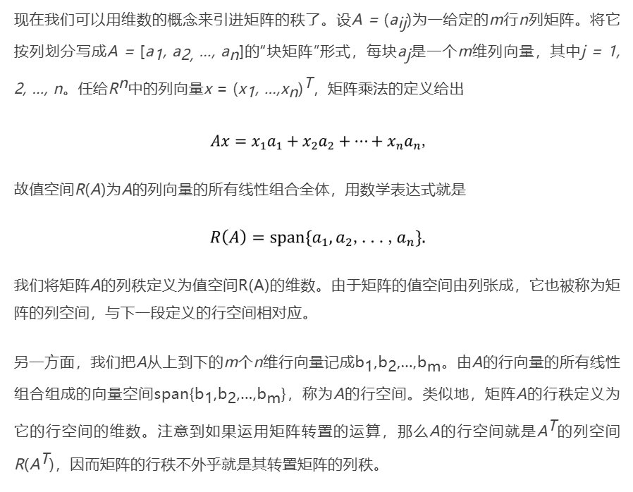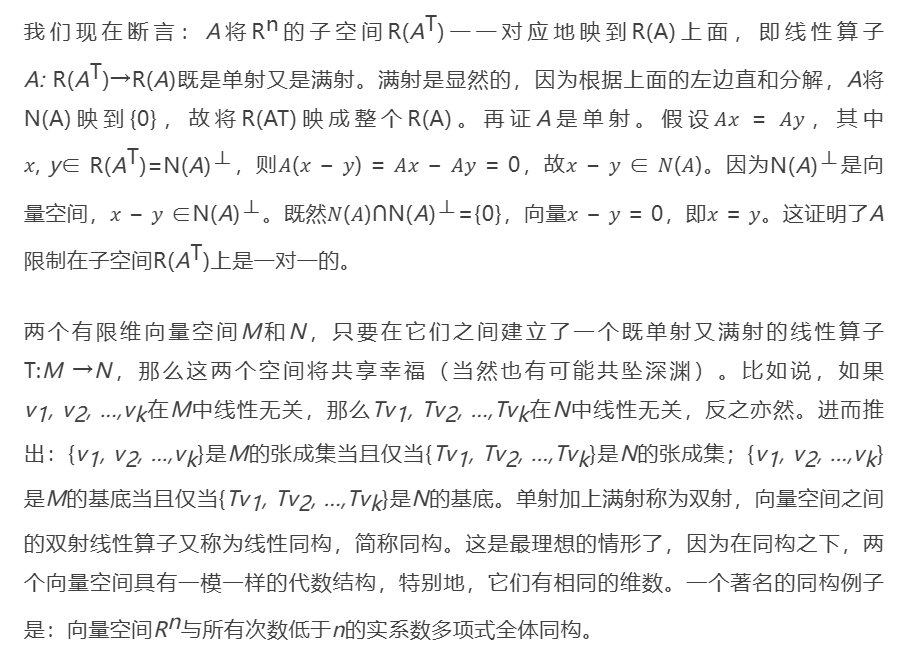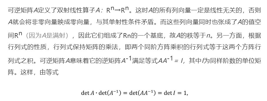 通过行列式学过矩阵秩的读者自然会问最后一个问题:你们定义的秩等于我们的教科书中定义的秩吗?回答是,是的,它们是同一个整数。但在这里,我们不打算细致讨论行列式与矩阵秩的关系,因为这些关系相当地繁琐,这里就不赘述了。但是,只要考虑可逆矩阵A这一特殊但并不太失一般性的情形,还是能洞察到用“最大非零子式阶数”和用“线性无关张成集向量个数”这两种方法定义矩阵秩的等价性。