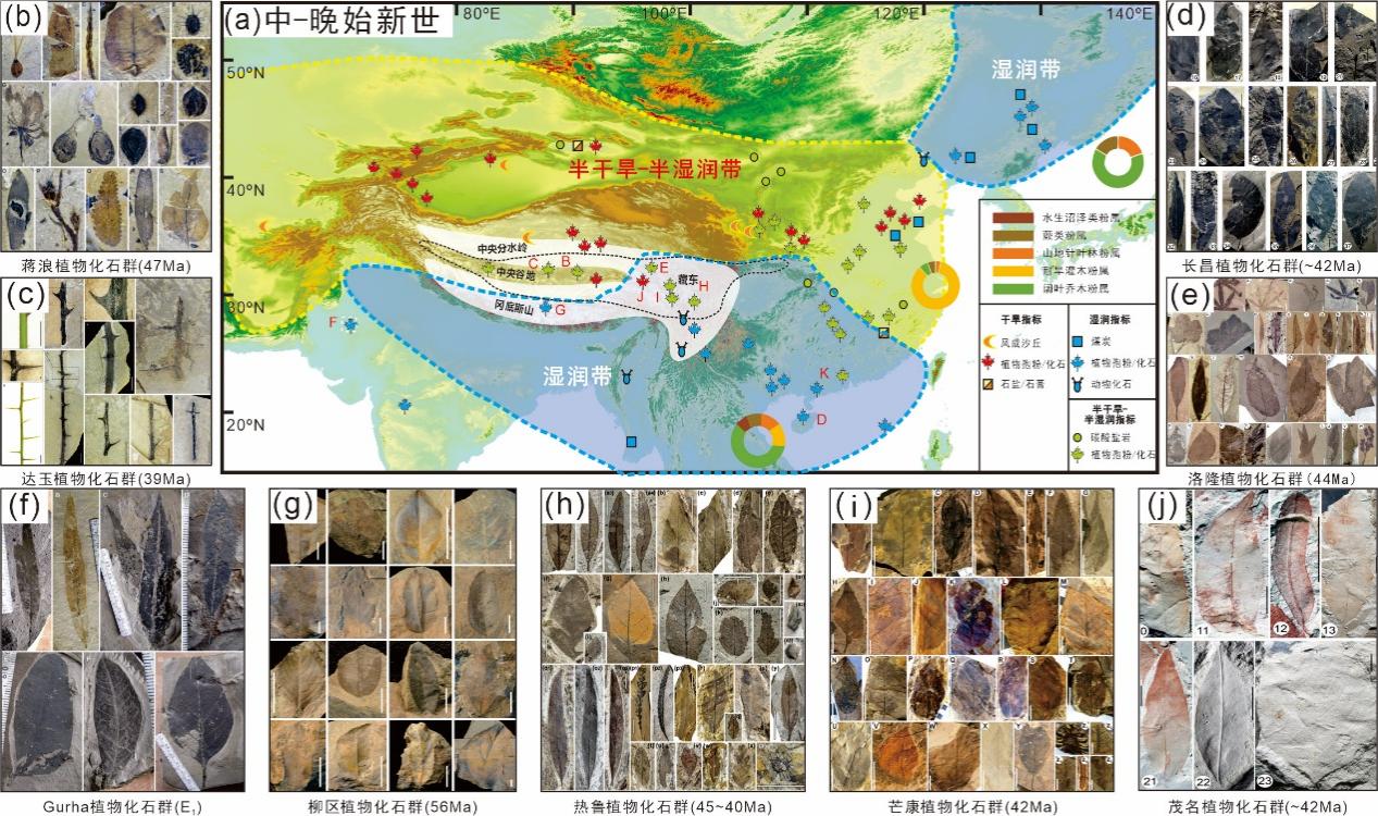 图5 中-晚始新世青藏高原及邻区典型气候和植被指标分布图