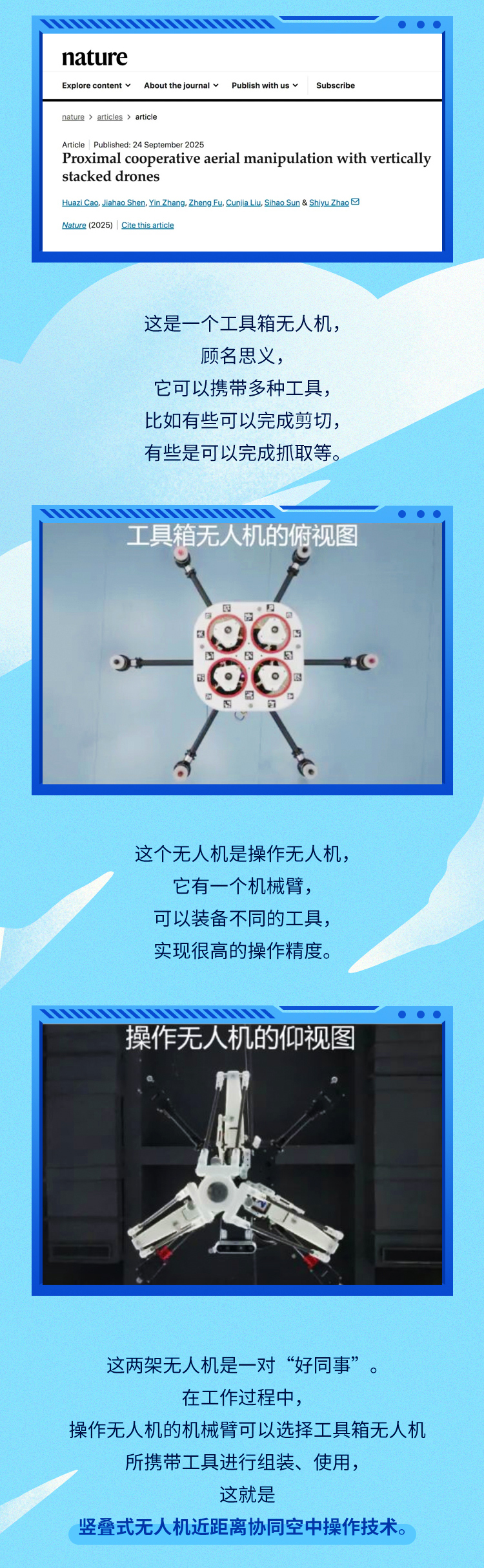图文简介: 西湖大学赵世钰团队研发的FlyingToolbox系统突破无人机协同作业世界级技术难题,成果于2025年9月登上《自然》杂志,实现多旋翼无人机在强风环境下的厘米级精准工具交换。