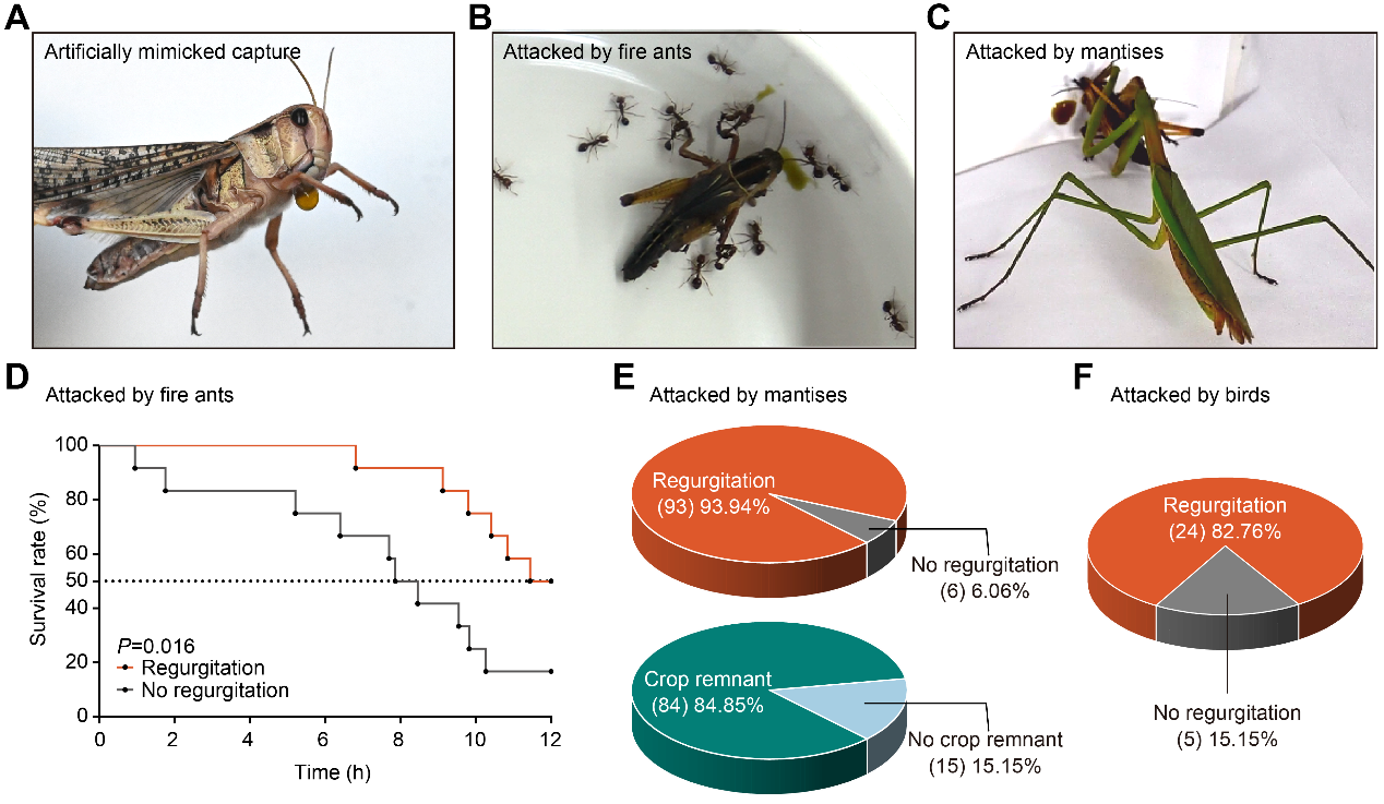 蝗虫在受到威胁时常会从口中吐出深棕色液体,这是昆虫界常见却少被深入研究的现象。研究团队通过行为学实验发现,当遭遇红火蚁、螳螂、麻雀等天敌攻击时,80%—90%的蝗虫都会迅速吐出反流液,这些反流液能显著增加蝗虫的存活率。一口反流液,足以让捕食者“吃不下去”。