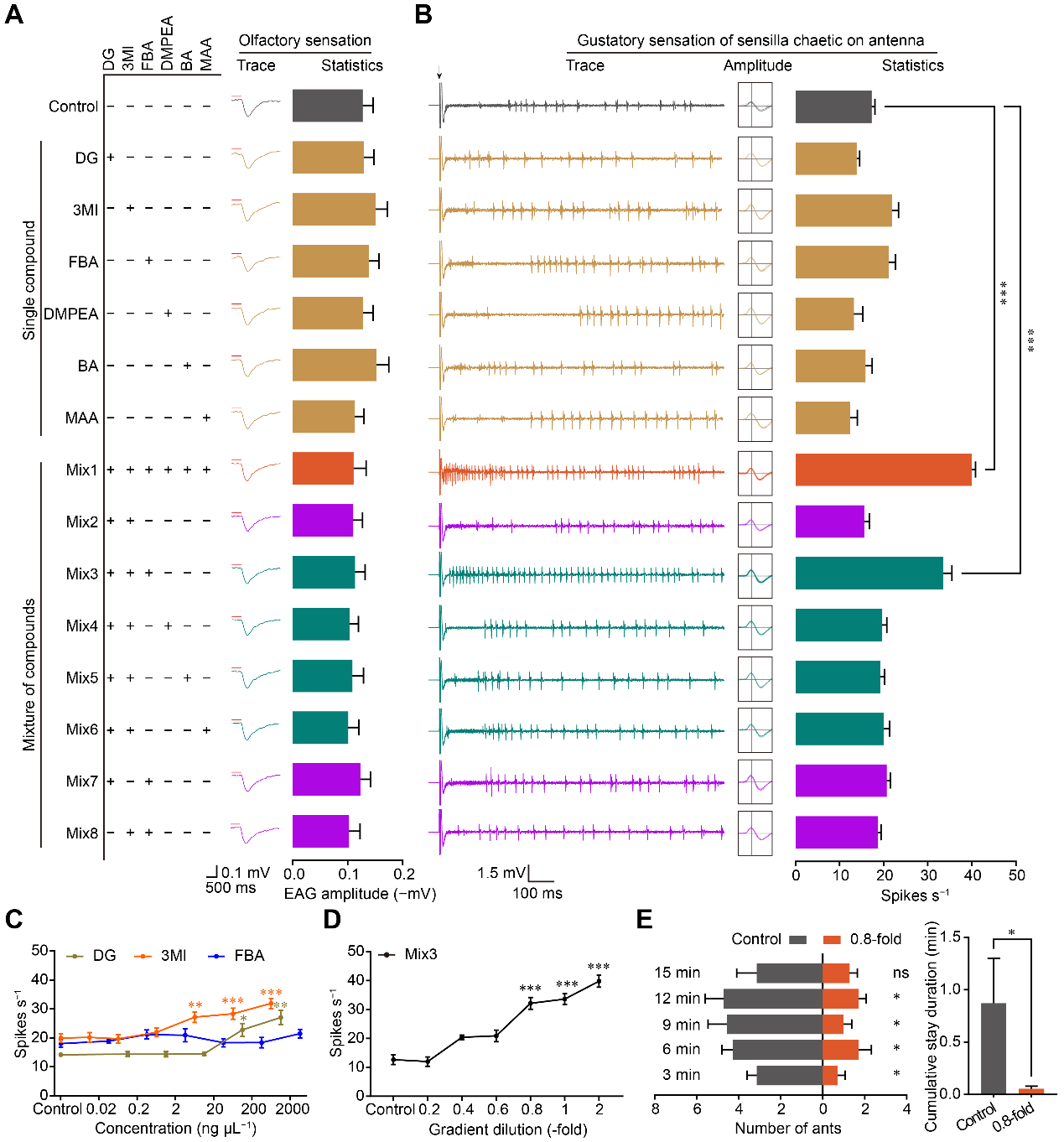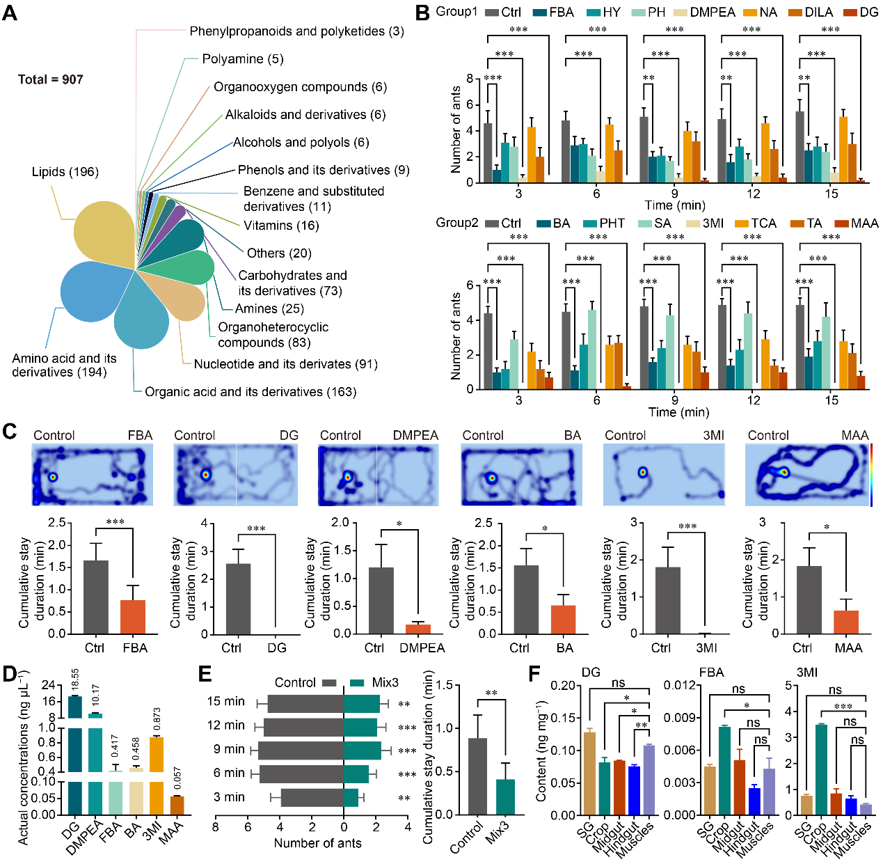红火蚁是否被“味道”吓退?研究团队进一步利用电生理技术(EAG、SSR)发现:上述混合物不会刺激红火蚁的嗅觉,但会强烈激活其触角上的味觉响应;行为上,混合物对红火蚁表现出明显的防御行为。这是一种典型的“接触型化学防御”机制——只有当捕食者真正接触猎物时才会被击退。