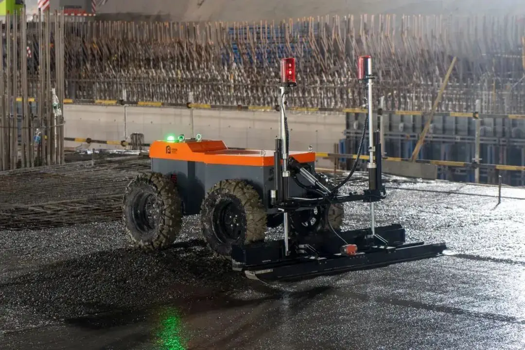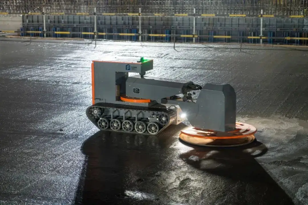 在需要浇筑巨大面积地坪的区域,激光整平机器人、抹平机器人和抹光机器人会组成流水线。三者利用激光高程控制、路径规划、恒压控制、力控传感与AI自适应、专业工艺系统等技术,互相配合从而实现混凝土的初步整平、提浆、收面、精加工等工艺的流水线作业。