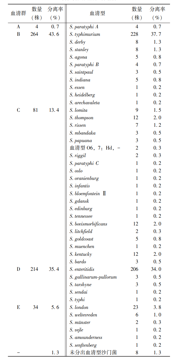 605株沙门菌中,597株鉴定出血清型,共鉴定出42种血清型分属于5个群,其中B群占比最高(43.6%),D群占比次之(35.4%),C群占比13.4%,E群和A群占比较少,分别为5.6%和0.7%,42个血清型中鼠伤寒沙门菌占比最高,达37.7%,为全国地区优势血清型,其次为肠炎沙门菌,占比34.0%(表1)。