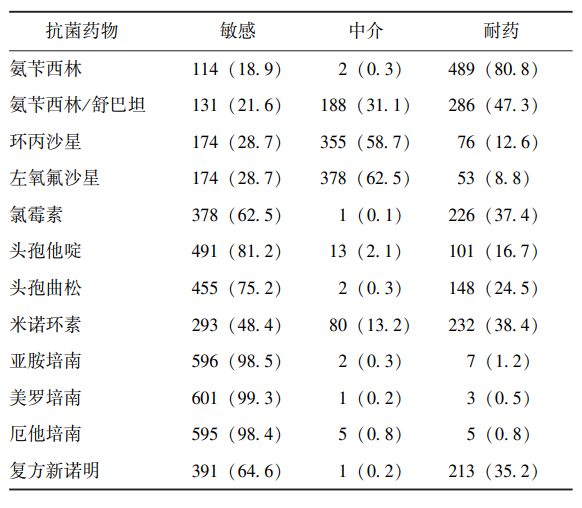 表2 605株沙门菌菌株药敏试验结果[n(%)]