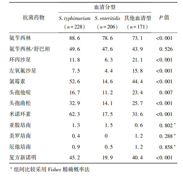 表3 鼠伤寒沙门菌、肠炎沙门菌以及其他血清型沙门菌对抗菌药物耐药率比较(%)