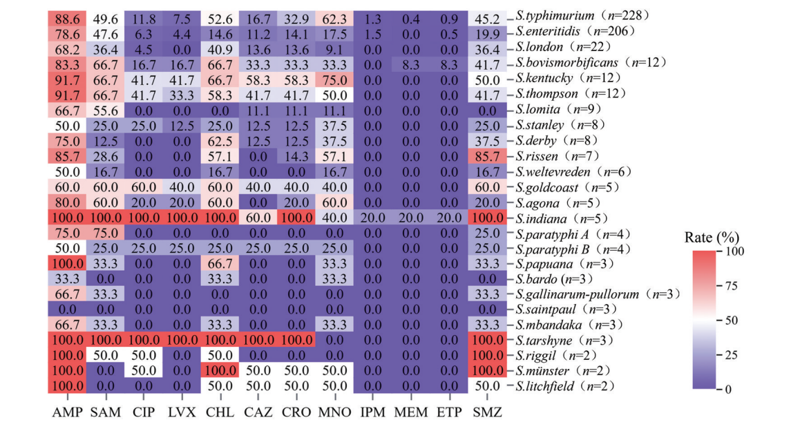 除斯坦利沙门菌、韦太夫雷登沙门菌、乙型副伤寒沙门菌、巴尔多沙门菌、圣保罗沙门菌外,其余均对1种及以上的抗菌药物具有较高的耐药性(图1)。