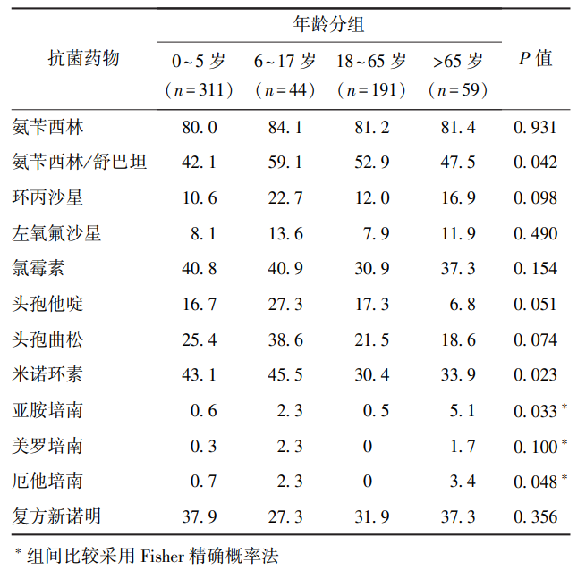 沙门菌对氨苄西林/舒巴坦、米诺环素、亚胺培南、厄他培南在不同年龄阶段的耐药性差异均有统计学意义(P均<0.05)。6~17岁人群分离株对氨苄西林/舒巴坦(59.1%)和米诺环素(45.5%)的耐药率较高,65岁以上人群分离株对亚胺培南(5.1%)和厄他培南(3.4%)的耐药率较高(表4)。患者性别与各抗菌药物耐药性关联无统计学意义(P>0.05)。