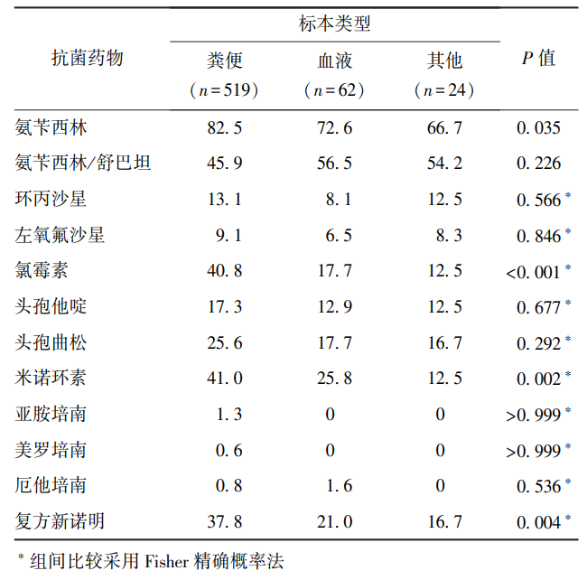 2.3.4 沙门菌耐药特征与标本类型的关系