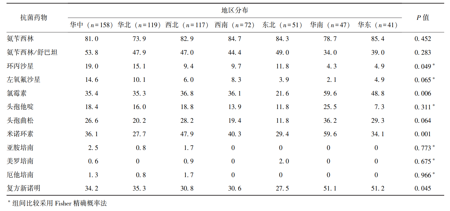 不同地理区域分离的菌株对环丙沙星、氯霉素和米诺环素、复方新诺明的耐药性均有统计学差异(P均<0.05),其中华中地区分离菌株对环丙沙星耐药率最高(19.0%),华南地区分离菌株对氯霉素(59.6%)和米诺环素(59.6%)耐药率最高,华东地区分离菌株对复方新诺明的耐药率最高(51.2%)(表7)。