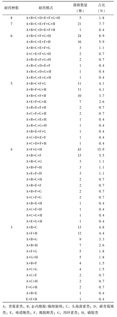271株沙门菌为MDR(44.8%),MDR模式共48种,其中包含青霉素类(A)的MDR模式46种,数量最多的一种MDR模式为青霉素类(A)+酰胺醇类(F)+四环素类(G)+磺胺类(H),占比为15.9%(表8)。