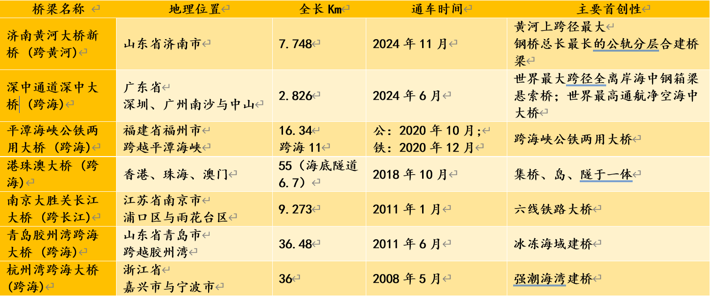 济南黄河大桥新桥 (跨黄河)、南京大胜关长江大桥 (跨长江)、深中通道深中大桥 (跨海)、平潭海峡公铁两用大桥 (跨海)、港珠澳大桥 (跨海)、青岛胶州湾跨海大桥 (跨海)、杭州湾跨海大桥 (跨海)。
