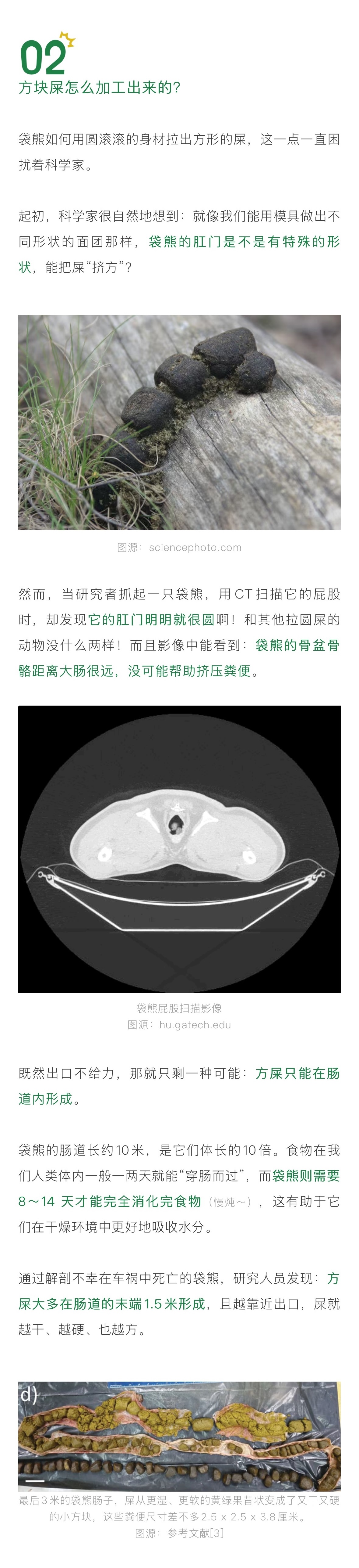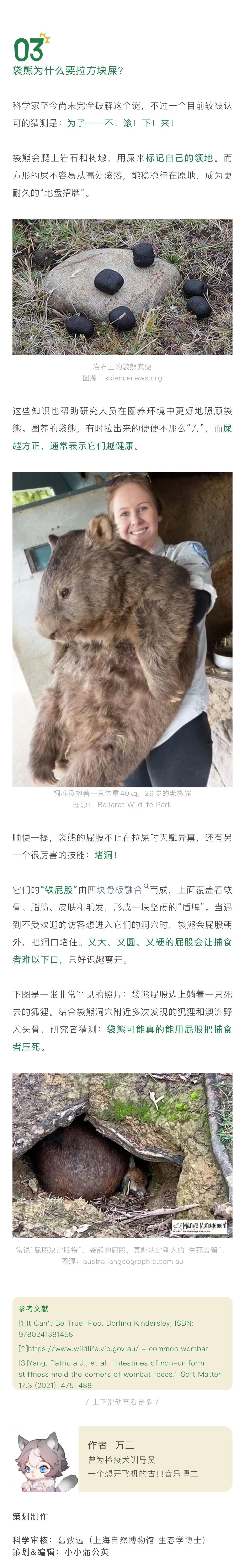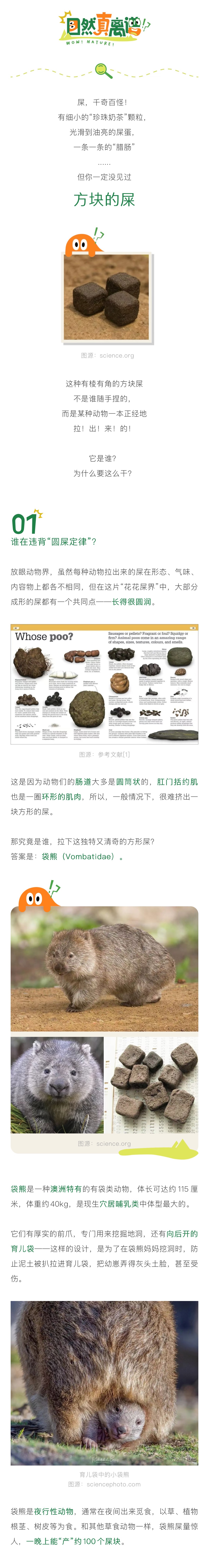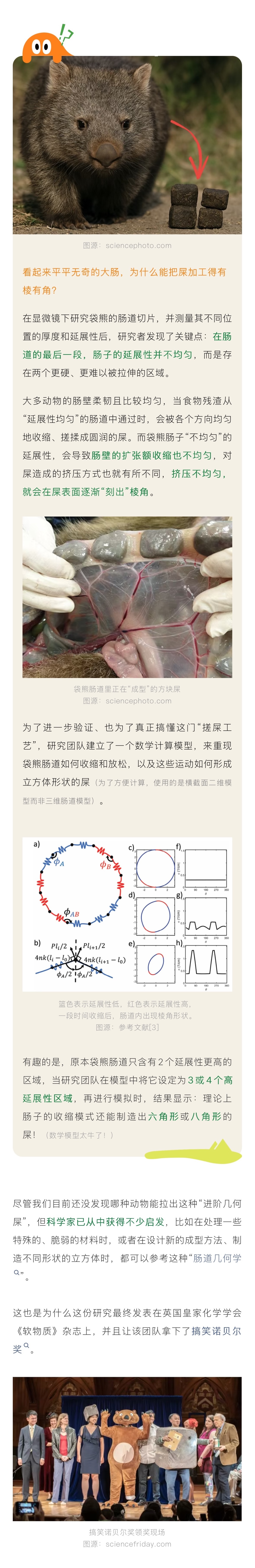 图文简介: 袋熊独特的“方块屎”:通过肠道延展性不均匀把粪便“搓”成立方体,科学家用模型重现成型机理,并推测方块屎更利于标记领地,还因此收获搞笑诺奖。