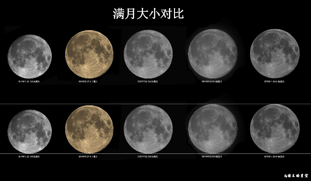 由于月球的公转轨道是个椭圆,月球与地球距离大约在36万到40万千米之间变化,由此带来的月球视直径在29’20”至34′6”之间变化,最大和最小的满月直径相差大约14%。这个差异普通人用肉眼观察很难察觉,但训练有素的观测者依然能感到不同满月的大小。