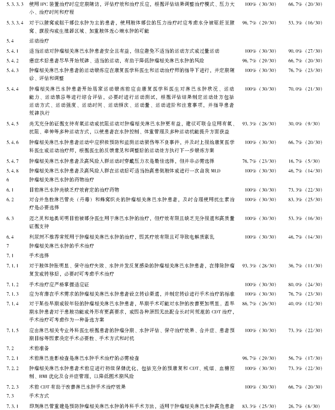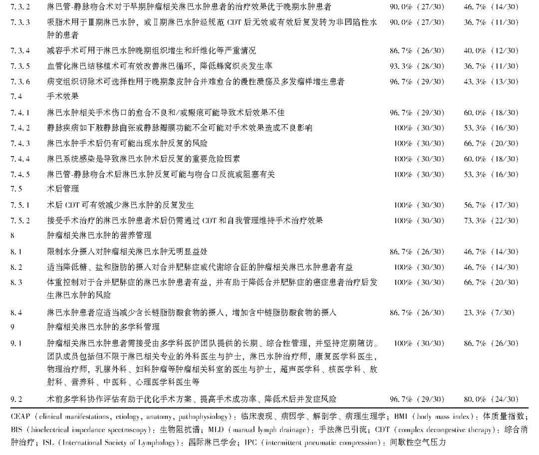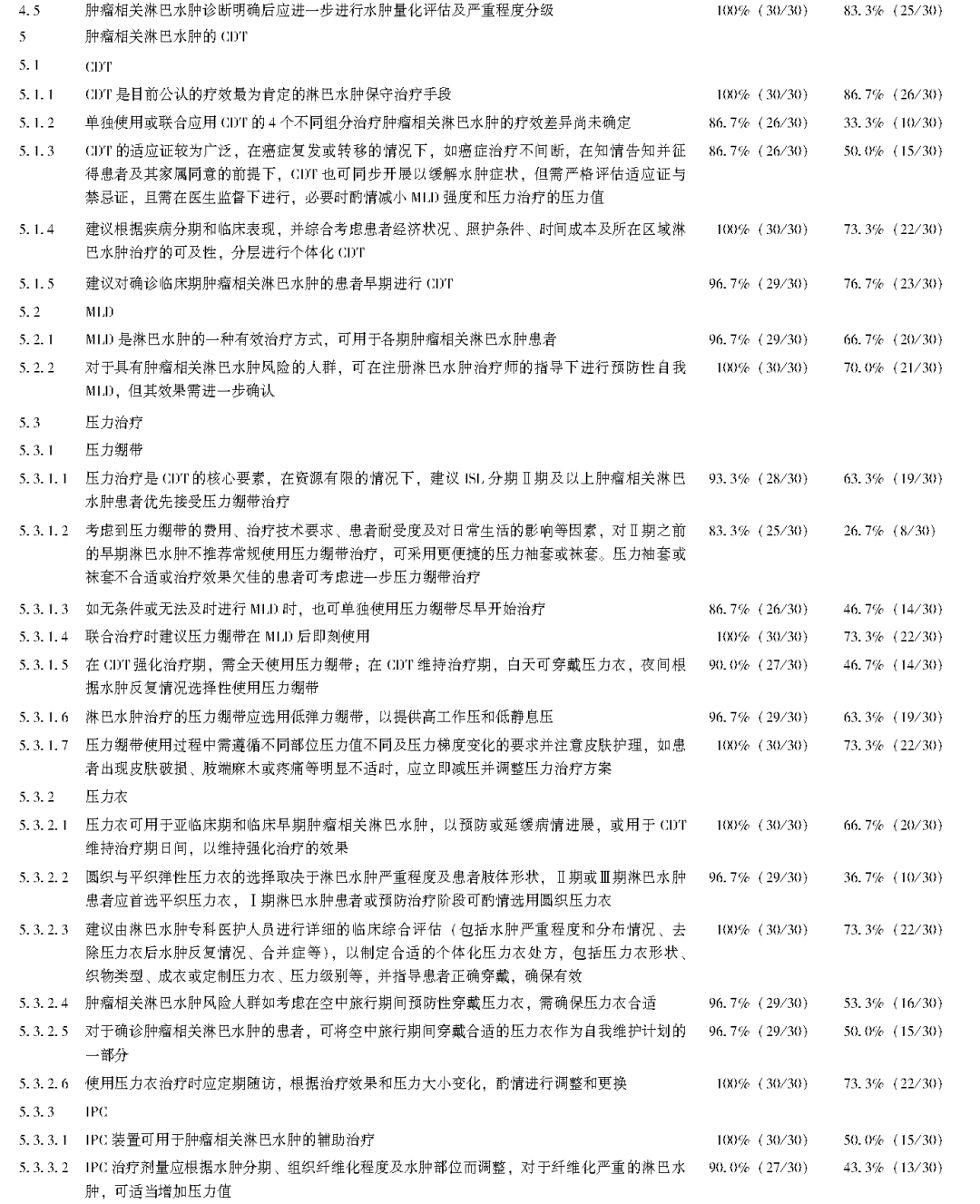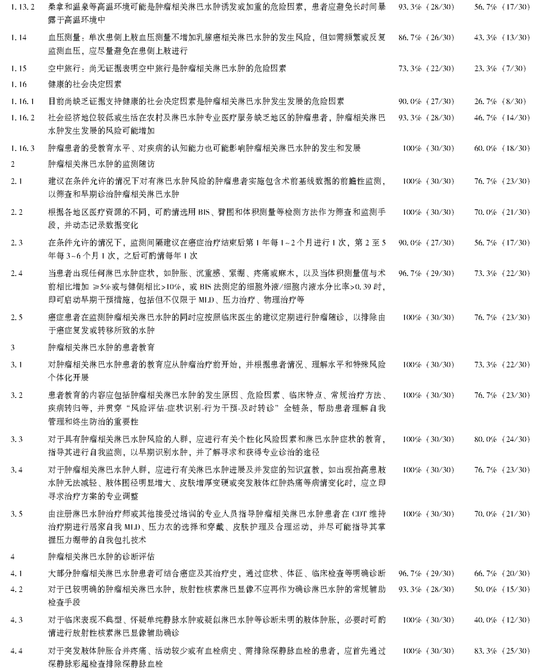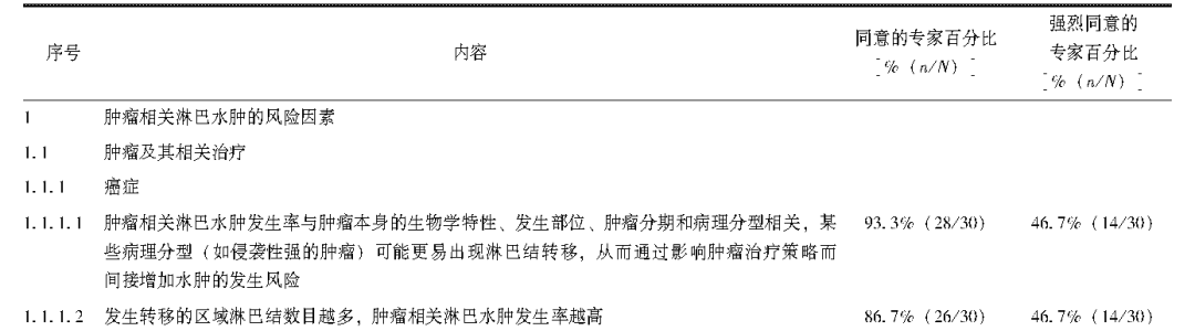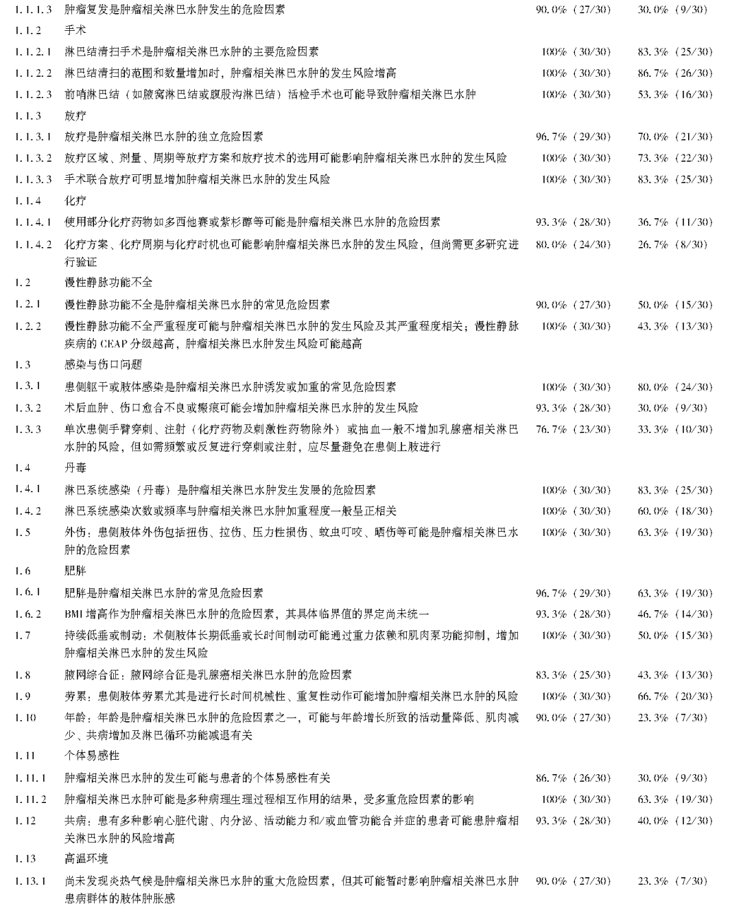 经统计,共发出专家邀请33份,其中30位专家接受邀请并提供了完整的反馈意见,参与了本共识的制订。平均年龄(46.2±7.8)岁,从事淋巴水肿相关临床及研究工作年限为(10.4±5.7)年,53.3%(16/30)的专家从事淋巴水肿相关领域工作10年及以上。学历为博士11人,硕士10人,本科9人;职称为正高级14人,副高级8人,中级6人,初级2人。函询专家积极性系数为100%,学术水平为0.827,对咨询内容的熟悉程度为0.947,对咨询内容的判断依据为0.987,权威系数为0.920。
