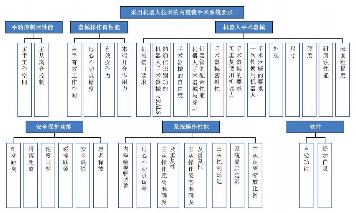 本标准中对系统的要求包括手动控制器性能、器械操作臂性能、系统操作性能、安全保护功能、机器人手术器械、软件6个部分,详见图1。标准的整体架构还充分考虑到性能要求、机械安全、功能安全等临床问题,且设备应具有必要的保护功能。