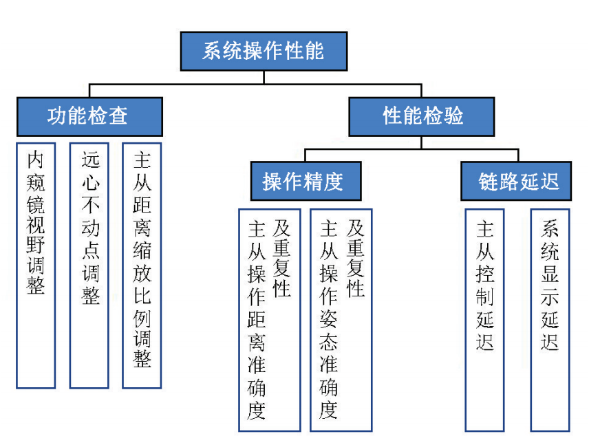 RALS的整体操作性能评估需综合考察各组件间的协同工作能力,重点验证包括内窥镜视野调整、远心不动点调整、主从距离缩放比例调整在内的3个核心功能,应通过实际操作检查确认有无。性能检验包括主从操作距离准确度及重复性、主从操作姿态准确度及重复性、主从控制延迟以及系统显示延迟,从风险管控角度可分为操作精度和链路延迟两部分(图3)。