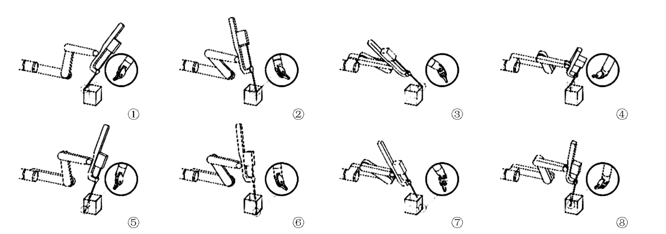 姿态精度测试也需选取工作空间立方体的8个顶点作为不利点,测试8种不同姿态,其中任意2个姿态变化间旋转轴角变化应>15°,且需通过≥2个姿态驱动轴实现姿态转换,详见图4(图片来源为标准YY/T 1941-2024)。不同姿态测试可充分模拟术中复杂操作场景,以验证产品在不同术式以及不同器械操作下姿态的符合性。