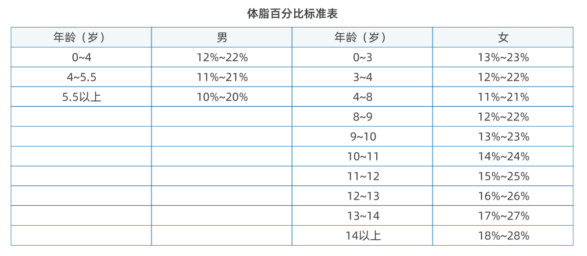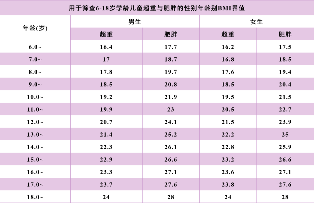 儿童在不同年龄段超重肥胖判断标准是不一样的。如果想知道孩子胖没胖,请对照下图判断。