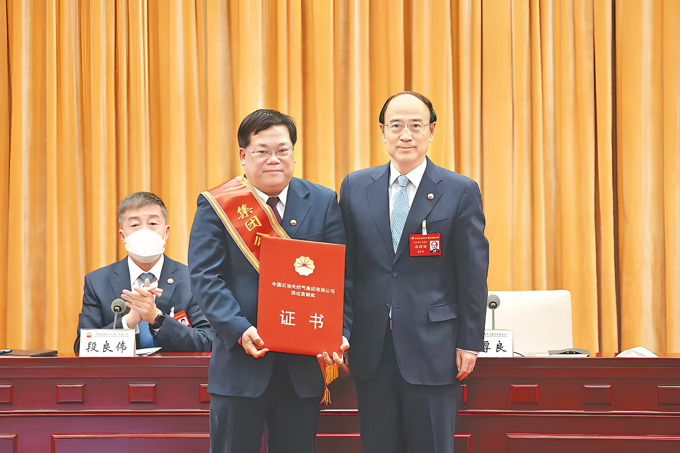 ▲戴厚良董事长(右一)给廖广志颁发2022年度中石油“突出贡献奖”