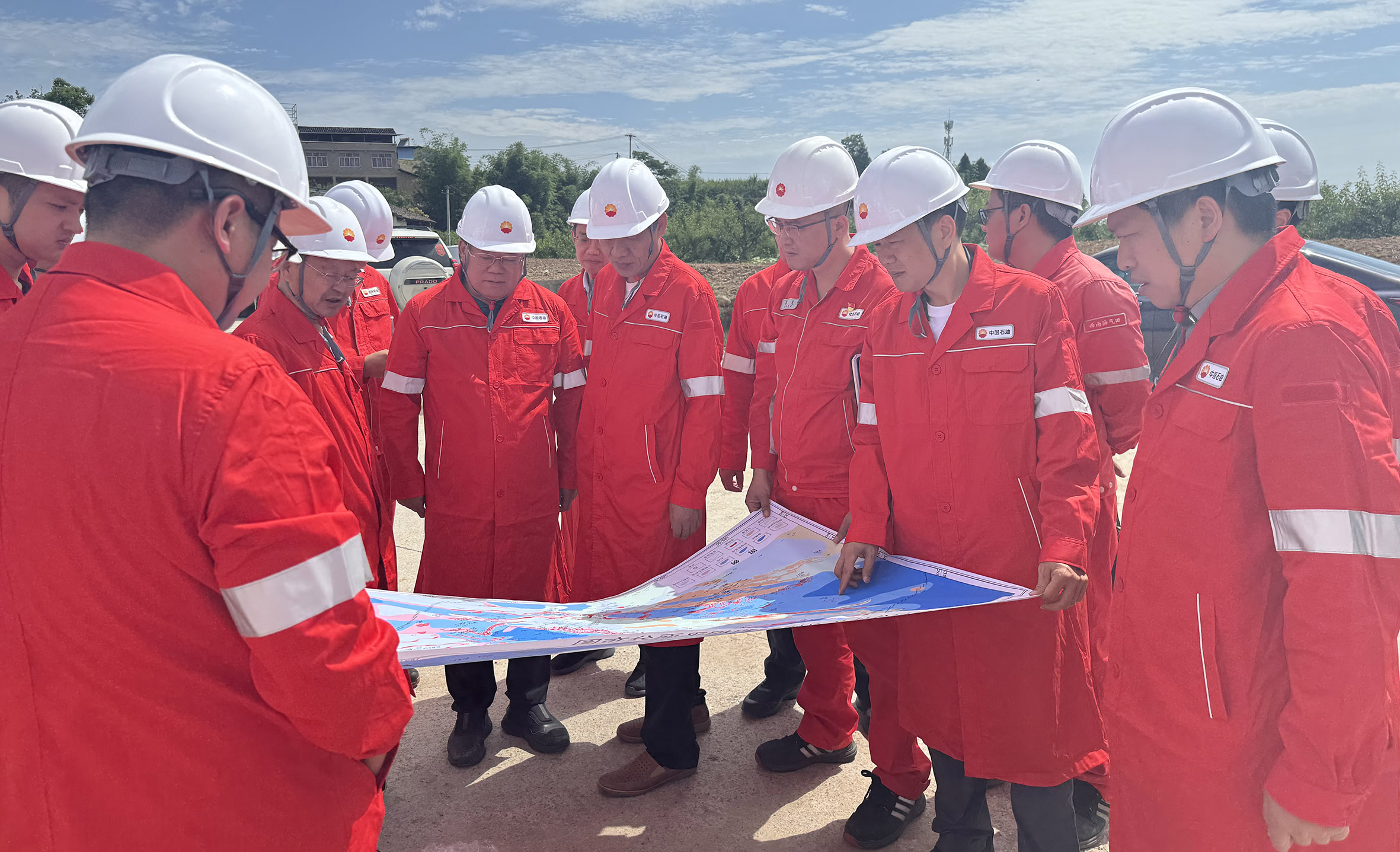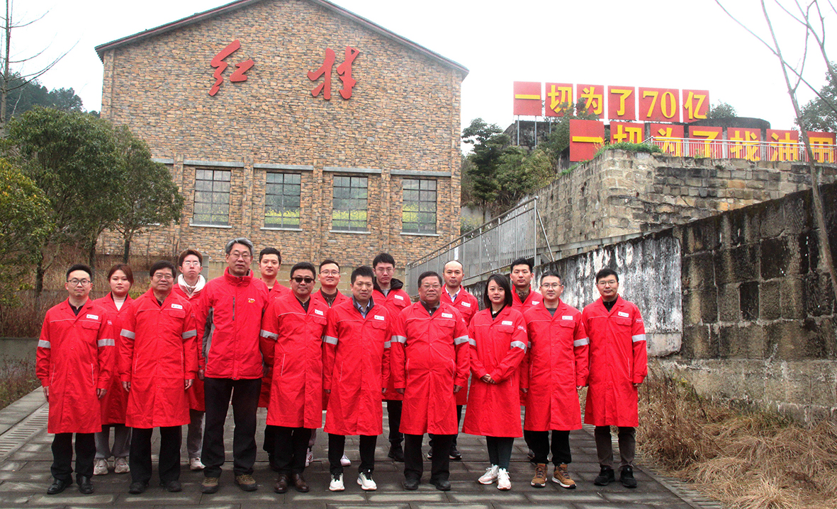 ▲廖广志(前排右四)和联合体团队参观学习四川石油会战红村精神