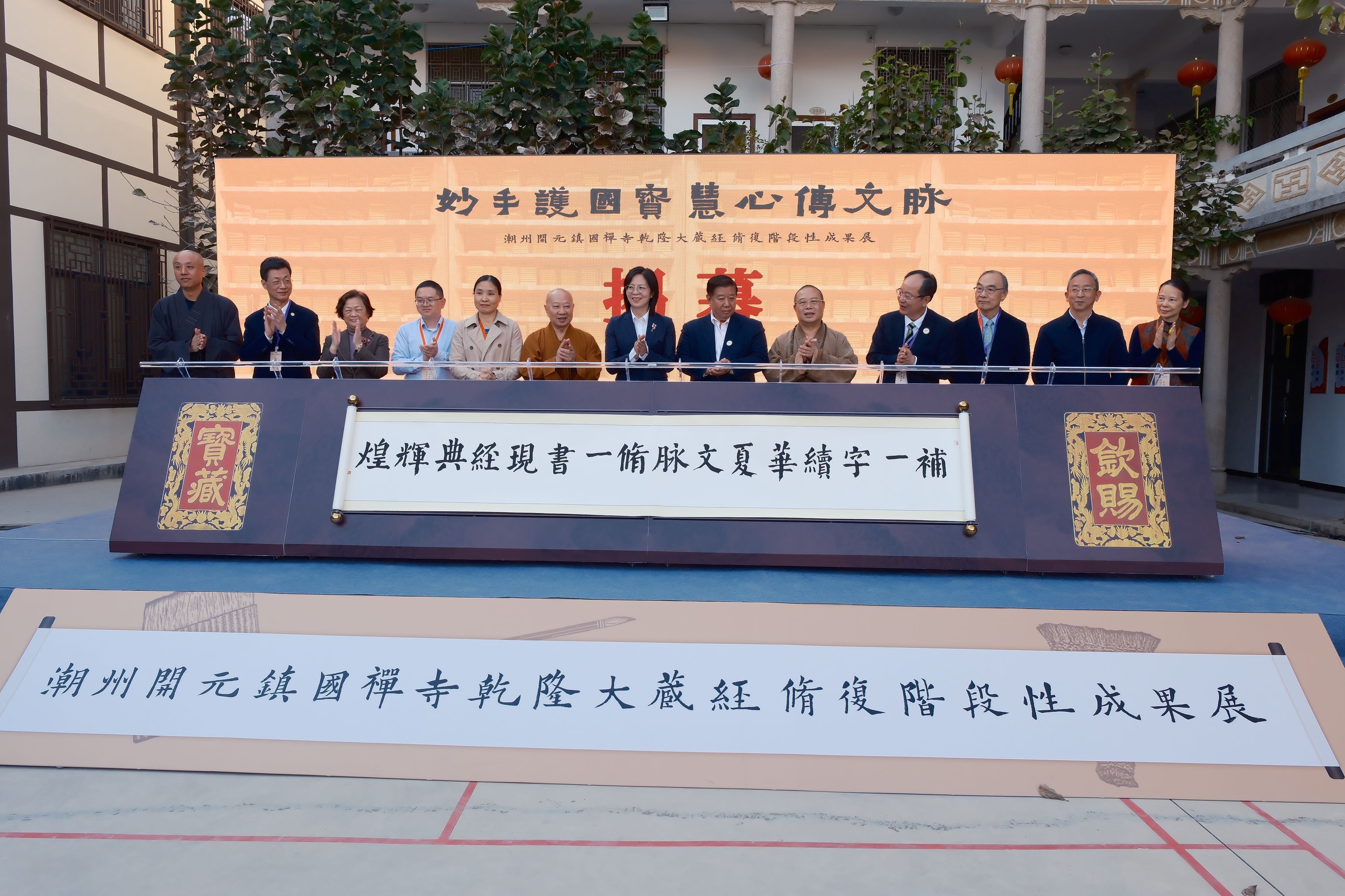 开幕式上,来自国家图书馆、广东省立中山图书馆、潮州市政府,以及修复导师与海外潮团代表等嘉宾共同见证展览启动。