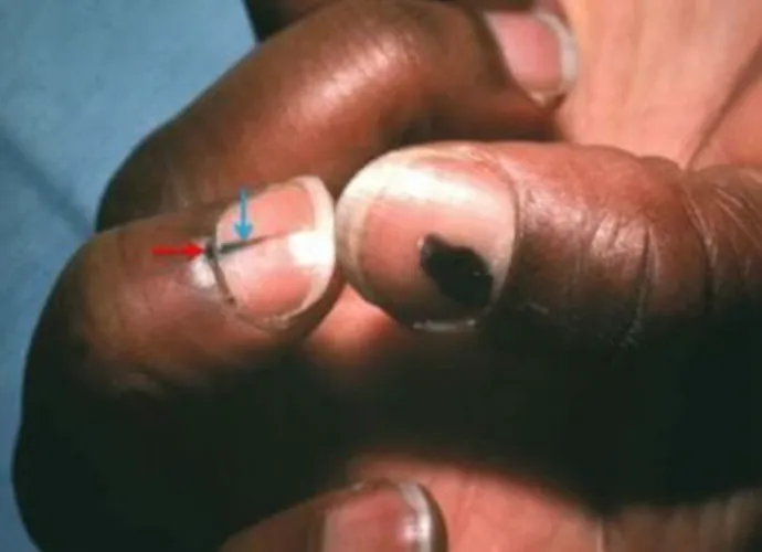 如果指甲的黑色纵线从头至尾一以贯之,就说明指甲生长的原点出了问题,而且问题持续存在,导致这个结果的原因可以有很多种。