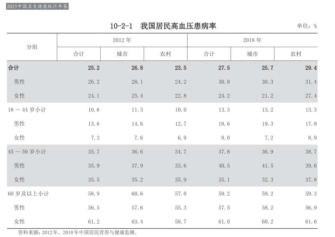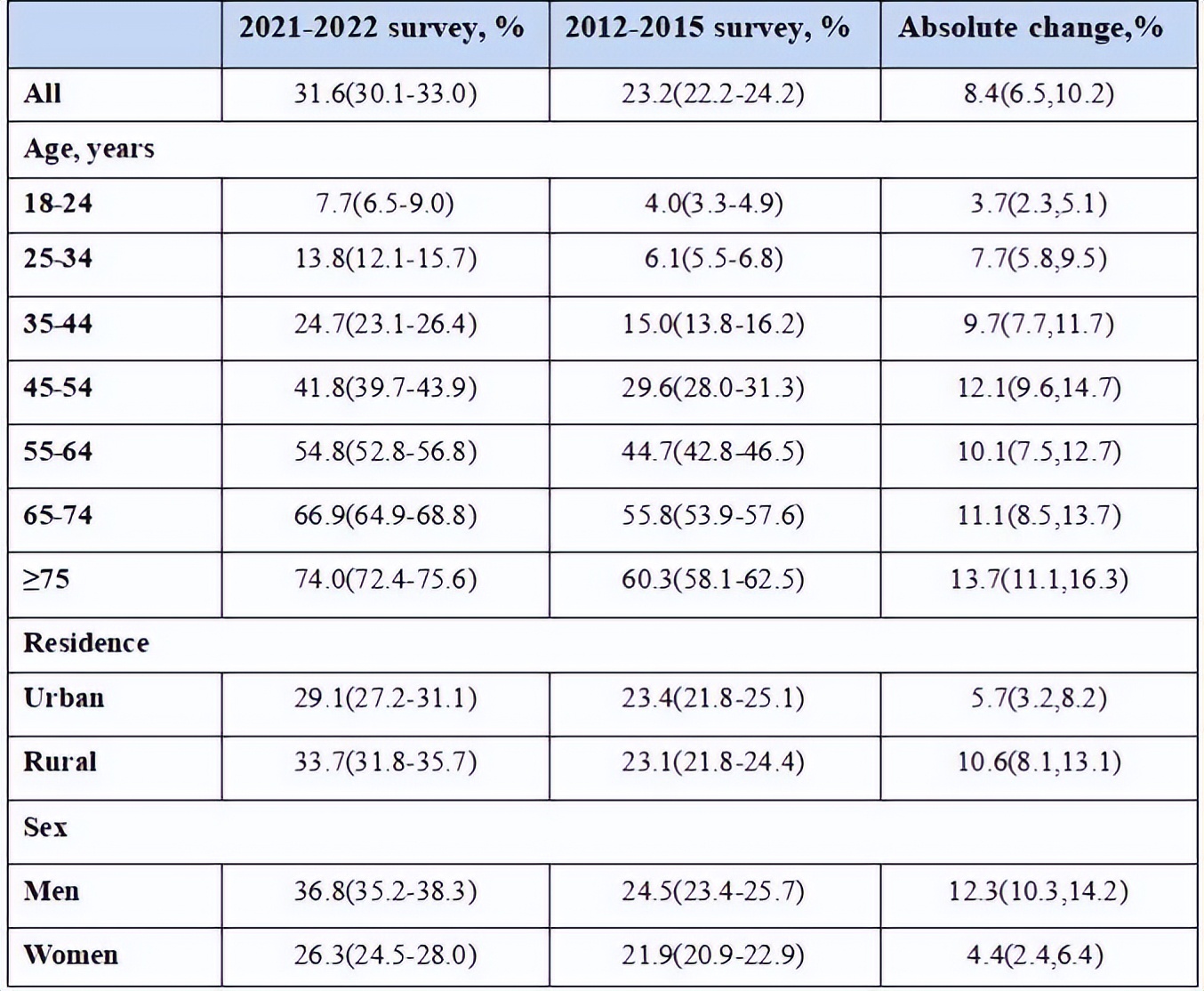 2012年是25.2%,四分之一;2018年是27.5。而最新的比例根据论文研究是31.6%(2021–2022年高血压加权患病率为 31.6%)