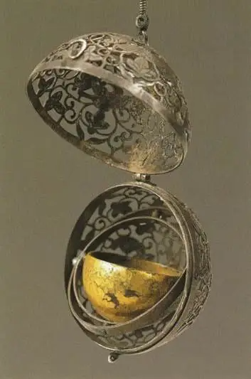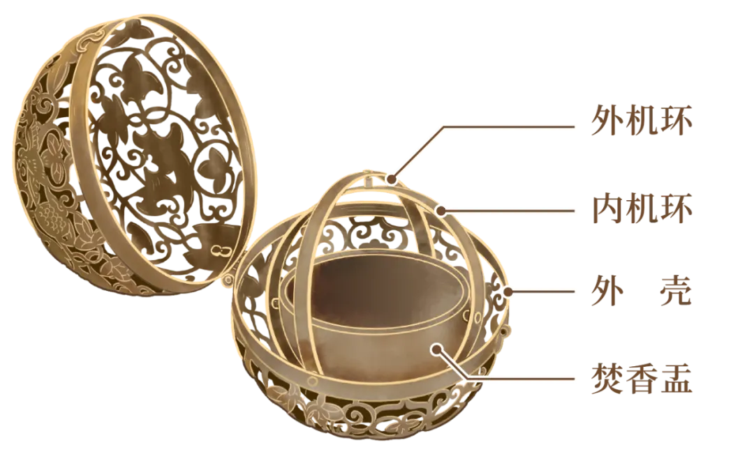 香料不外洒的原因,与一种叫做“同心圆机环”的结构有关。同心圆机环由两层垂直相交的银质环构成,外层机环与外壳相连,内层机环分别与外层机环和盛放香料的焚香盂连接。这种结构能够保持整个焚香盂的稳定,不受外部晃动影响。
