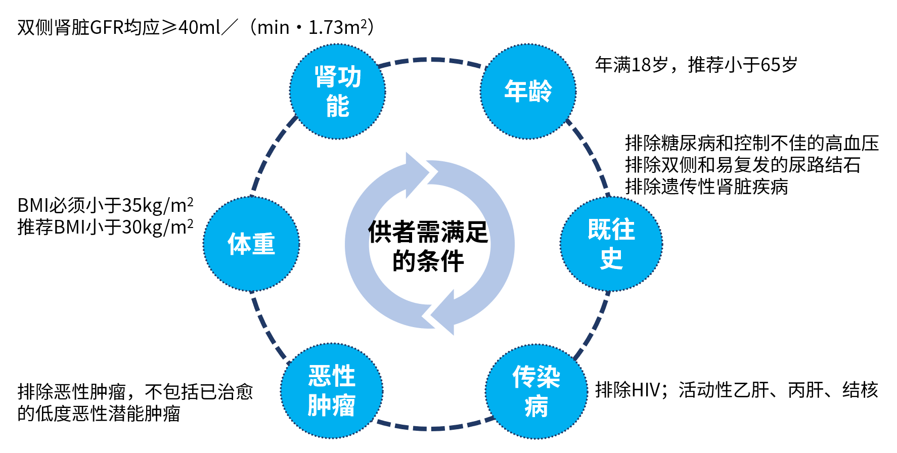 供者评估:包括血型和HLA配型、肾脏功能和解剖学检查、既往肾脏和全身慢性疾病史、恶性肿瘤筛查,确保供者捐献后健康不受影响。