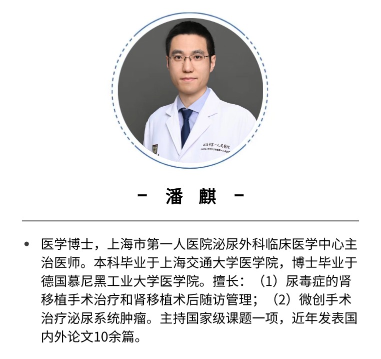 潘麒,医学博士,上海市第一人医院泌尿外科临床医学中心主治医师。本科毕业于上海交通大学医学院,博士毕业于德国慕尼黑工业大学医学院。擅长:(1)尿毒症的肾移植手术治疗和肾移植术后随访管理;(2)微创手术治疗泌尿系统肿瘤。主持国家级课题一项,近年发表国内外论文10余篇。