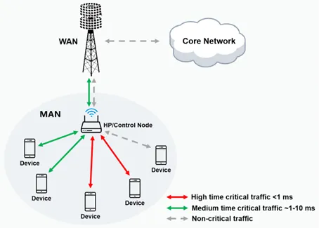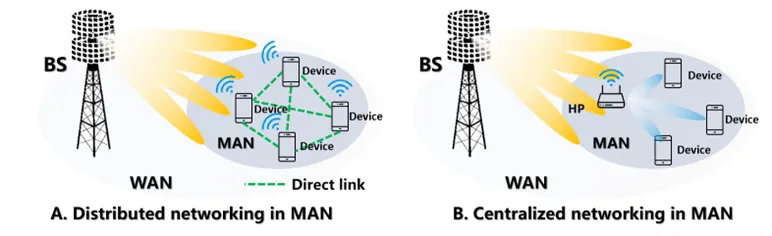 另一种是分层集中式组网,如图2右侧所示,针对每个微域新引入一个作为统一管理或控制的簇头节点(如HP,Head Point),微域终端可通过HP与广域或其它微域/终端进行数据交互。同时通过广域统一管理与控制微域HP,实现微域间/微域内的资源协调与干扰管理,有效降低传统自组织网络存在的资源碰撞及应对微域移动性带来的动态干扰等问题和挑战。