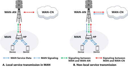 广域微域融合还需要支持微域终端与广域之间的非本地业务传输,充分利用广域计算资源,平衡微域和广域负载,灵活、高效的处理微域终端的各类业务。此外,微域非本地业务也包括微域间的业务传输,如一个微域的终端与另一个微域的终端间的信息传输,或两个微域HP间的信息传输等。针对微域非本地业务,可以基于中继模式通过微域HP与广域交互,其中控制信息传输示意如图4B所示。