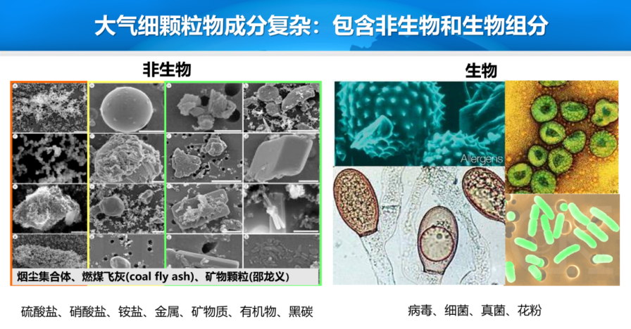 随着城市的发展,几乎所有城市都会面临空气污染问题。在众多空气污染物中,PM2.5最为关键。什么是PM2.5呢?PM2.5是指直径小于等于2.5微米的细颗粒物,还不到人类头发丝粗细的1/60,它们可能来自工业排放、机动车尾气、燃煤等。如果我们在显微镜下观察这些颗粒,会发现它们形态各异、成分复杂,可能是非生物性的硫酸盐、硝酸盐、重金属、有机物等,也可能是生物性的细菌、病毒、真菌、花粉等。