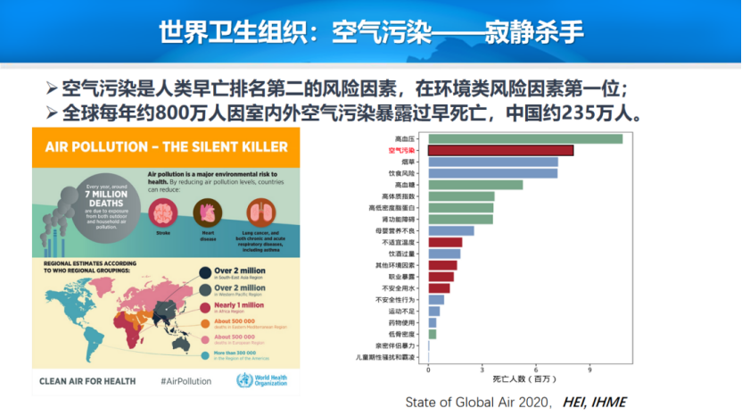 目前,空气污染已成为全球第二大健康风险因素,仅次于高血压,全球每年约800万人因室内外空气污染暴露过早死亡,中国约235万人。世界卫生组织将空气污染称为“寂静杀手”。有研究显示,空气污染对慢阻肺、中风、缺血性心脏病等疾病的贡献率达19%至40%。空气中的细颗粒物越小,越容易进入我们人体,它们能够进入上呼吸道、支气管、肺泡,甚至血液,最后进入大脑,进而产生一系列危害。有研究表明,空气污染可能会导致生育率部分下降,对儿童的生长发育产生不利影响,增加罹患阿尔茨海默症的风险。只有把空气污染控制下来,我们的健康才能得到保障。