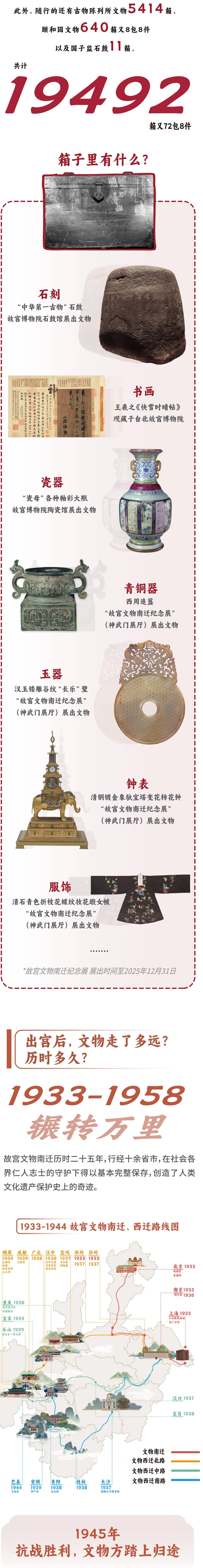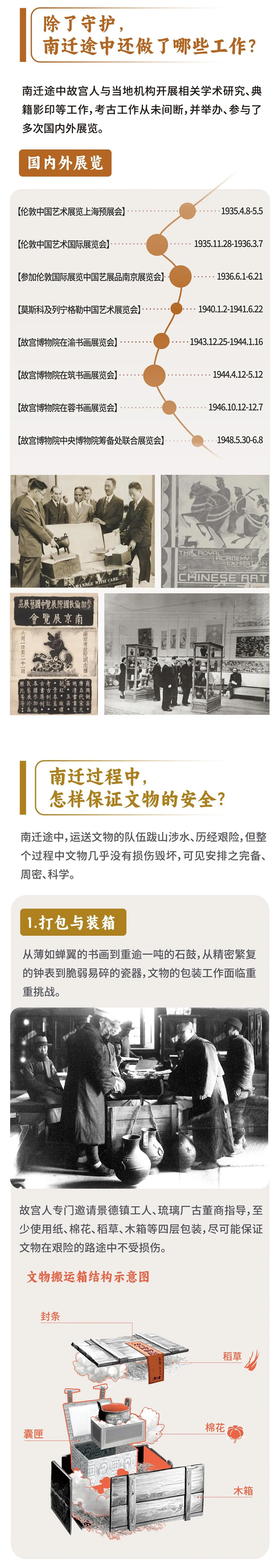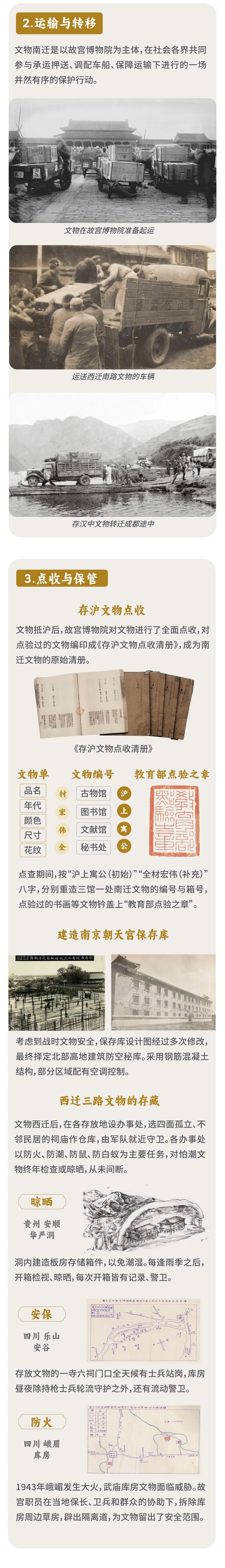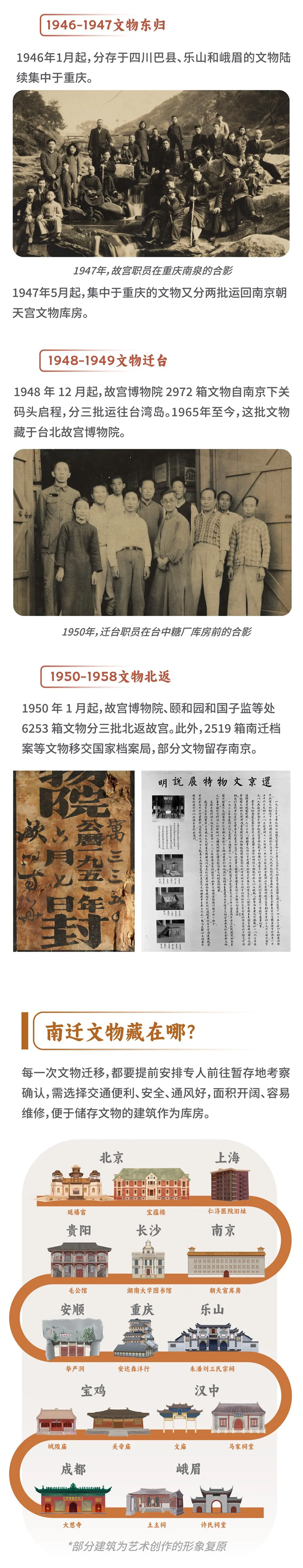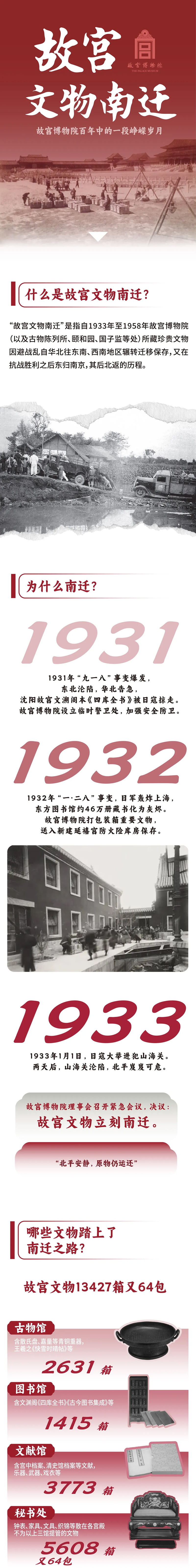 图文简介: “故宫文物南迁”是指自1933年至1958年故宫博物院(以及古物陈列所、颐和园、国子监等处)所藏珍贵文物因避战乱自华北往东南、西南地区辗转迁移保存,又在抗战胜利之后东归南京,其后北返的历程。