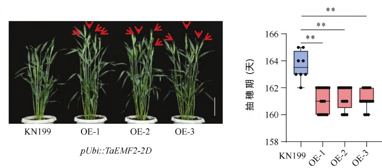 “多干活”实验也进一步印证,TaEMF2超表达转基因植株的抽穗期比对照植株提前了2~3天。两组实验共同证实,TaEMF2是可以调控小麦抽穗的“闹铃”基因(图3)。