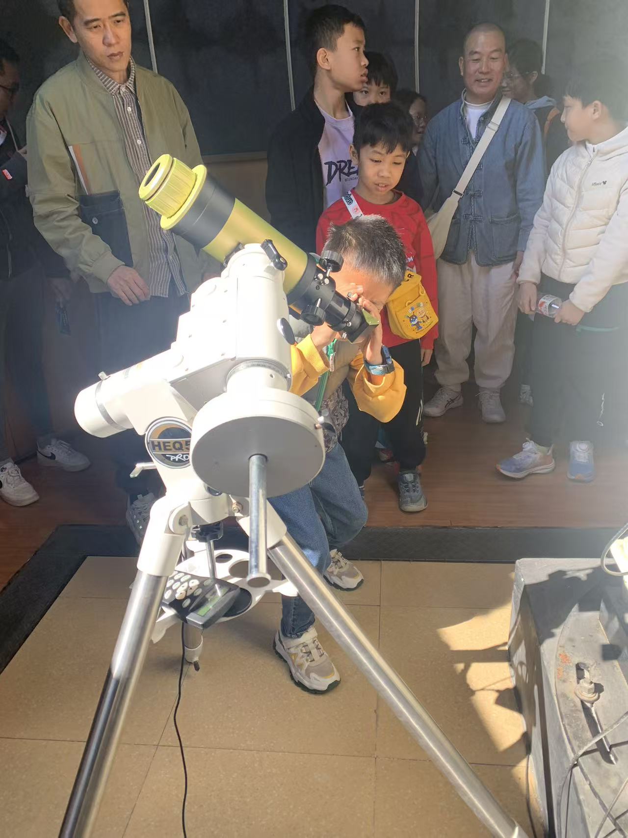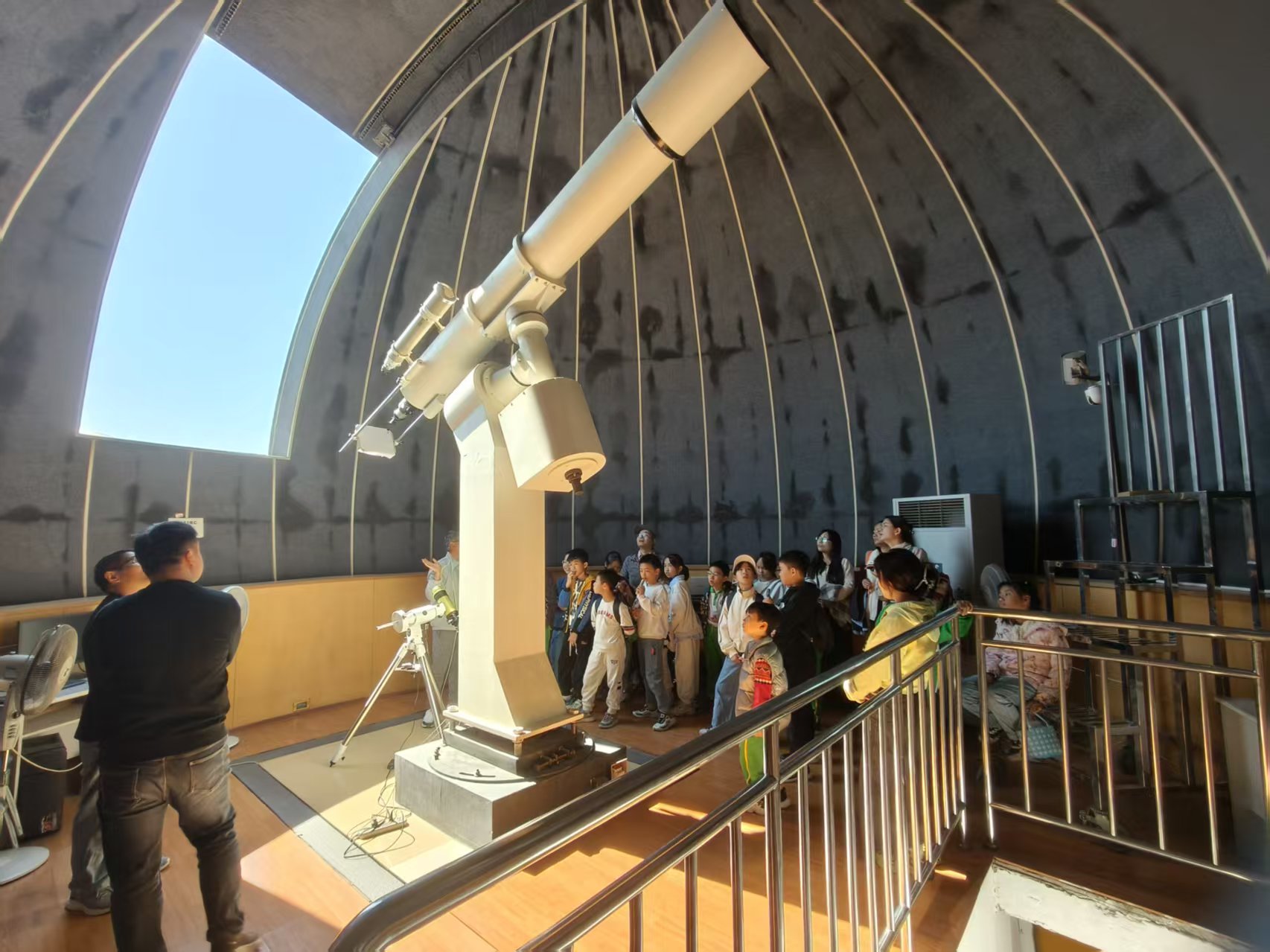 作为活动的“重磅环节”,天文台参观让孩子们的探索热情达到顶峰。此前的望远镜主题讲座,早已让大家对这个“看星星的地方”充满期待。当3、4米高的天文望远镜出现在眼前时,孩子们忍不住发出阵阵惊叹。工作人员详细介绍了这台望远镜的结构——从巨大的镜筒到精密的操控系统,每一个部件的功能都讲解得清晰透彻。工作人员还现场演示了望远镜的调试过程,讲解了如何通过它捕捉行星、星系的踪迹,让孩子们直观感受到天文观测的严谨与神奇,也对奇妙的天文世界有了更深刻的体会。