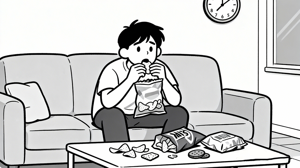 人在感到无聊时,产生机械化进食现象,也就是不自觉地通过吃东西来缓解这种情绪以获取满足感。这种状态下,人还会倾向于选择一些高油高糖的零食。这就导致了人会在不知不觉中摄入过多的热量。而人在注意力高度集中的状态,自然地就不觉得无聊了,也就不会再通过觅食行为获取情绪上的满足。