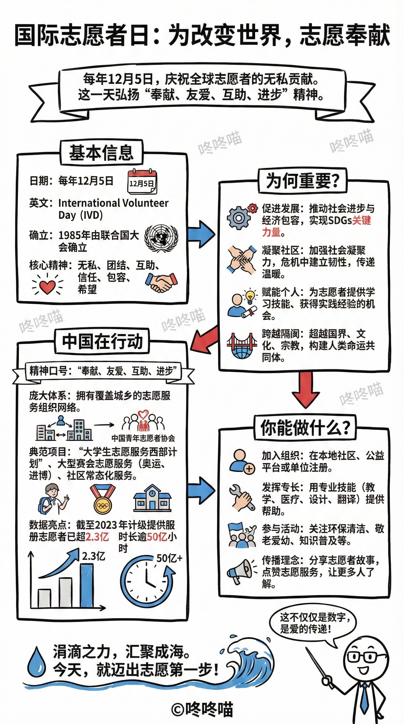 图文简介: 每一份不求回报的付出,都在让我们的世界悄悄变好。致敬全球超过2.3亿位志愿者——感谢你们用行动诠释:改变,始于每一个愿意伸出手的普通人。 今天,你也是那束光。
