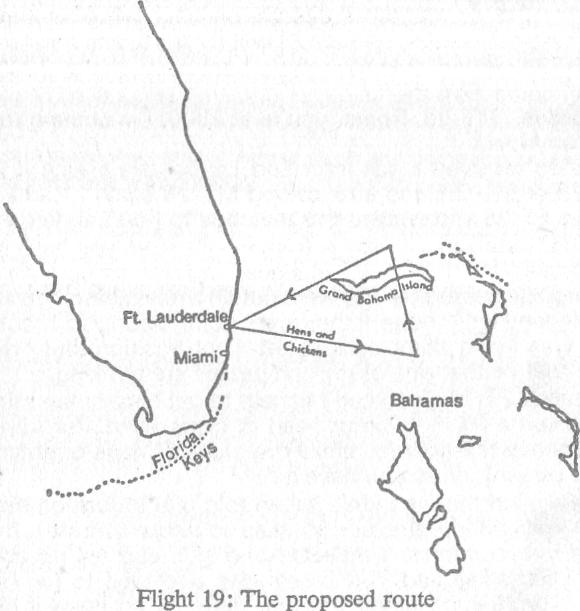 第19飞行中队事故区域。标识1-3:原定演习路线;标识4:中队偏航后无线电探测到的最后位置;标识5-6:马丁PBM-5“水手”救援机起飞与爆炸位置(图源:Wikipedia)