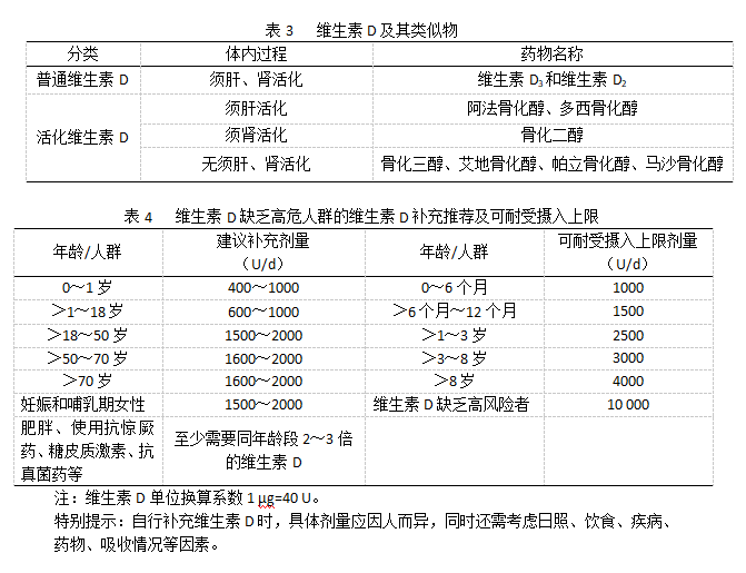药物作为维生素D的来源之一主要分为普通维生素D和活化维生素D(表3),维生素D缺乏高危人群的维生素D补充推荐及可耐受摄入上限见表4。