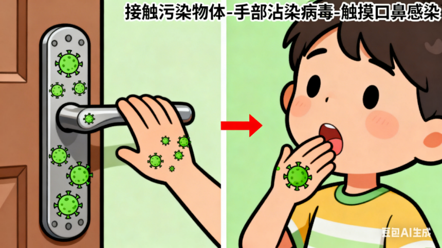 接触传播:孩子在学校共用玩具、餐具、学习用品,或在家庭中接触被患者污染的门把手、桌面等,手上沾到病毒后再摸口鼻,就容易让病毒“趁虚而入”。
