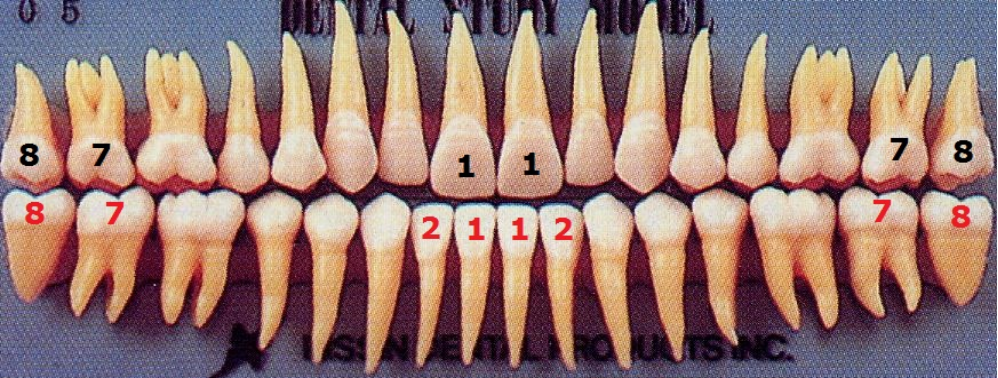 在没有缺失牙齿的口腔中,除下颌中切牙(1,左右各一颗)和上颌最后两颗牙齿(8,左右各一颗)只与一颗牙齿对应咬合之外,其余牙齿均与两颗牙齿对应咬合。