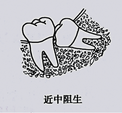 图源:专业教材,显示下颌智齿向近中倾斜,边缘嵴低于下颌第二恒磨牙,易引起塞牙