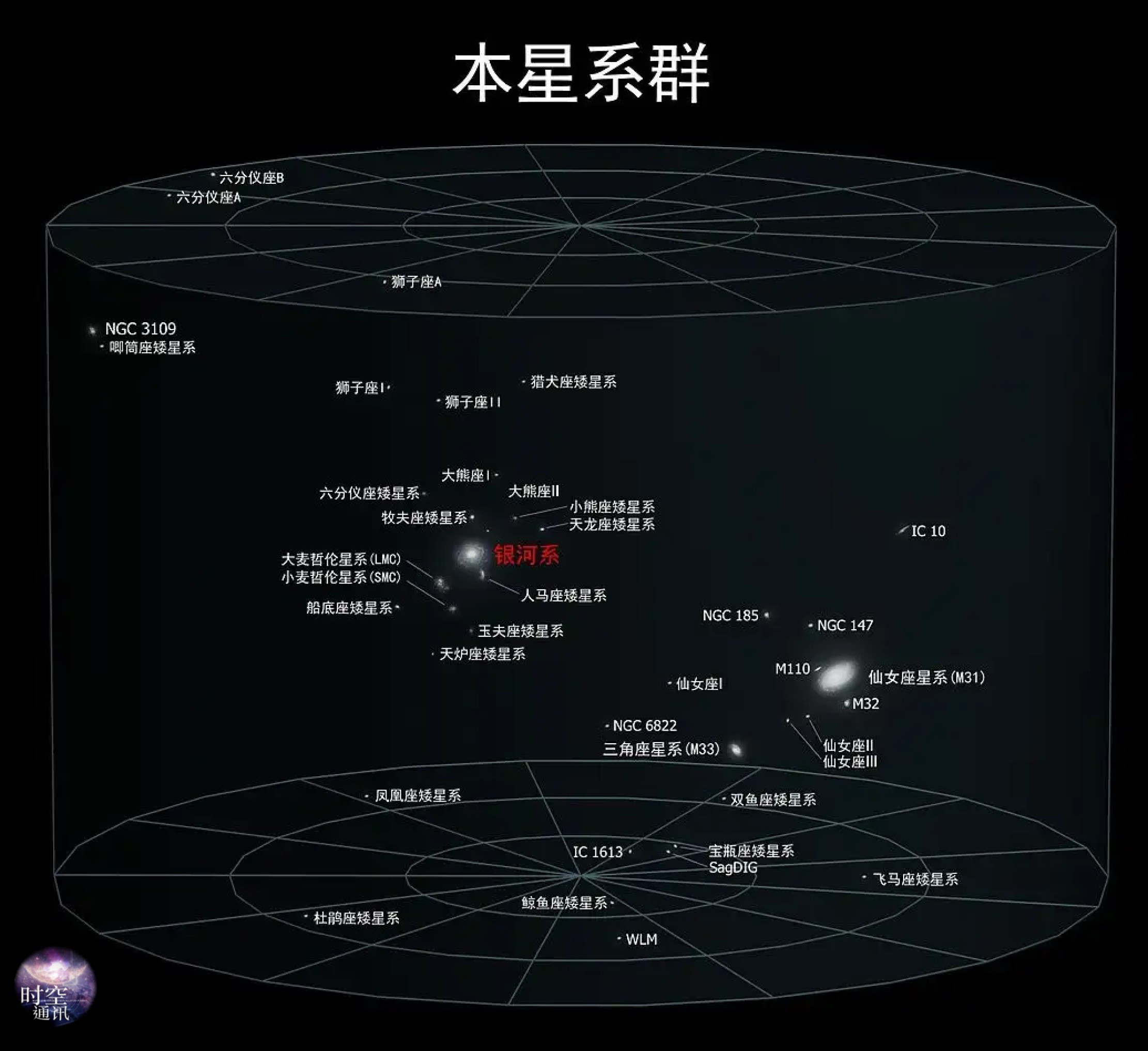 第四个层次,本星系群。质量约为银河系4.5倍,银河系与仙女座星系就占据了本星系群约90%的质量。本星系群跨度约1000万光年,是银河系的50倍。