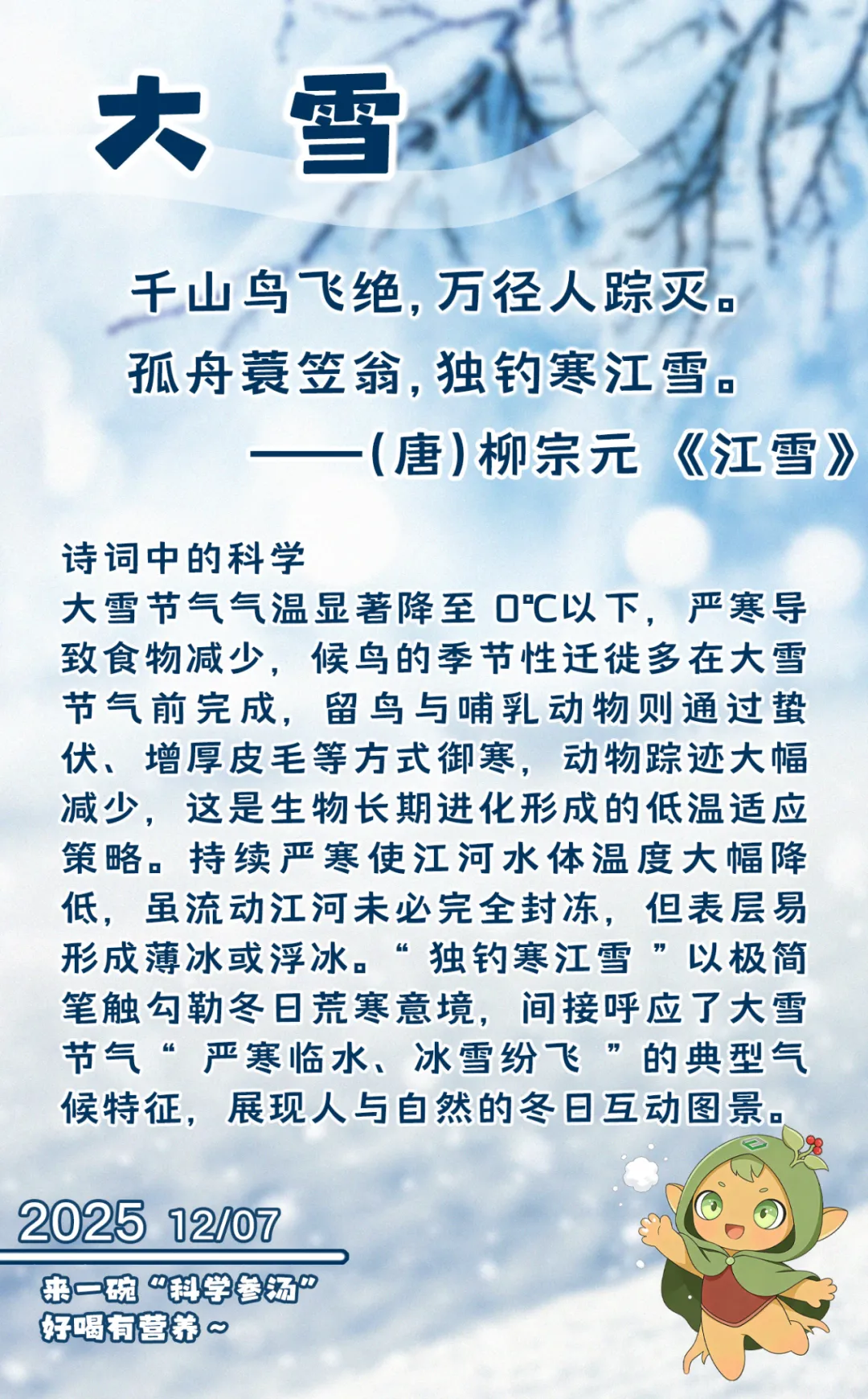 古人通过细致观察,将节气特征融入文学创作与日常生活。柳宗元 “独钓寒江雪” 捕捉了大雪节气临水严寒、冰雪纷飞的气候场景,是对节气特征的艺术化表达;民间 “大雪兆丰年” 的谚语,实则蕴含着科学道理——积雪中含有大量空气,导热系数低,能起到保温保墒的作用,防止土壤冻裂损伤农作物根系,春季积雪融化后还能补充土壤水分,为农作物生长创造有利条件,展现了古人对气候与农业关系的深刻认知。