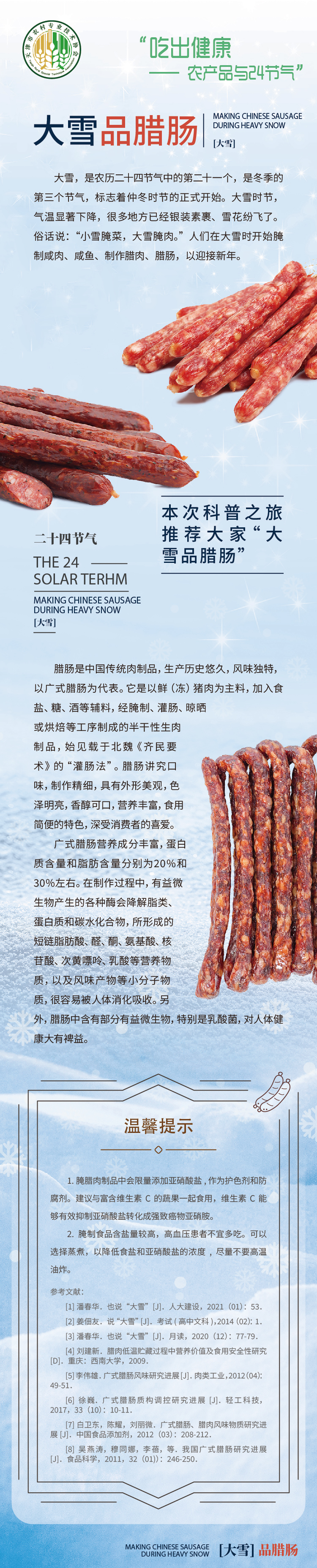 图文简介: 大雪,是农历二十四节气中的第二十一个,是冬季的第三个节气,标志着仲冬时节的正式开始。大雪时节,气温显著下降,很多地方已经银装素裹、雪花纷飞了。俗话说:“小雪腌菜,大雪腌肉。”人们在大雪时开始腌制咸肉、